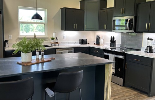 With three bedrooms and four full bathrooms, our retreat comfortably accommodates up to ten guests, making it ideal for families or groups of friends seeking a rejuvenating escape. The master bedroom features a king sized bed and both upstairs bedrooms feature plush queen-sized beds, ensuring a restful night's sleep amidst the tranquil sounds of nature.