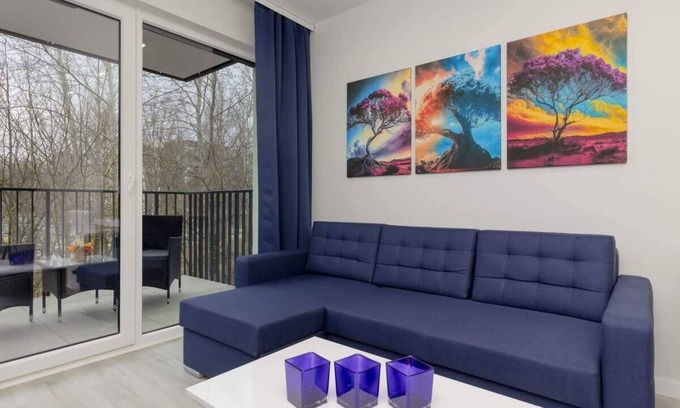 This flat is designed for four people and has been stylishly furnished in shades of dark navy blue, grey, and muted white. The bedroom is dominated by a light shade of pink - the pastel composition is conducive to a pleasant rest after a day's activities. The room is furnished with a double bed, as well as a capacious wardrobe for storing clothes and other accessories needed during travel. The living room has been furnished with attention to functionality - there is a dining table with chairs, as well as a desk for comfortable remote working, a coffee table and television. In addition, there is access to a furnished balcony, where you can sit to drink your morning coffee or admire the surroundings. The practically equipped kitchenette allows guests to prepare meals easily and quickly - both the preparation of snacks and large dishes is very comfortable here. A shower is located in the bathroom. Those planning a trip with their pets can bring their pets here. The modern and elegant décor makes this a great place for families and couples alike. The tasteful arrangement allows you to enjoy your time in this large space.