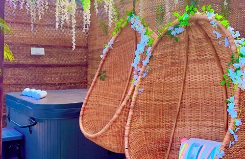 Outside, guests can enjoy the private pool with a hanging swing, hot tub, bar with hanging chairs, pergola with hanging beds and chairs and outdoor dinning.