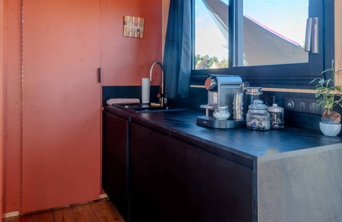 This tiny house, with its black exterior reminiscent of the mushrooms that envelop the Cognac cellars, transports you into an authentic world. The interior, decorated in copper and brick colours, is reminiscent of the old distilleries.