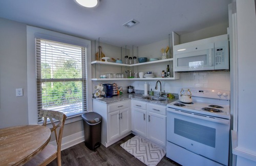 This adorable apartment is located just 1 mile from Bryant Denny Stadium and walkable to Downtown Tuscaloosa! The apartment has 1 king bed, a fold out futon (twin size), 1 full bath with a walk-in shower, and holds up to 3 guests. In the living room you can relax and watch tv or play board games with friends! The kitchen has all electric appliances and plenty of kitchen supplies, including a Keurig single cup coffee maker with starter supplies! The private bedroom comes equipped with a tv and sound machine. There is also a shared fire pit area, seating, and patio area for guests.