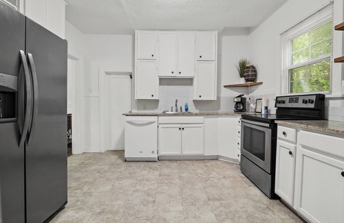 The fully equipped kitchen is a dream for food lovers. Stainless steel appliances, granite countertops, and all the cooking essentials make preparing meals a breeze — whether you're whipping up breakfast before heading to the Tulsa Zoo or hosting dinner with friends. Enjoy your meals at the stylish dining table or step out to the outdoor patio for al fresco dining in the private fenced yard.