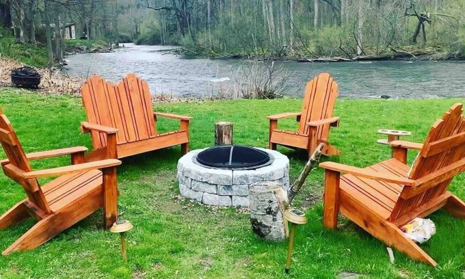 There are outdoor tables for dining and the campfire area that has Adirondack chairs.