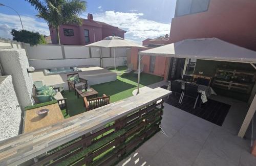 2.6 miles from Aqualand Maspalomas in Maspalomas, Oasis House features accommodations with access to a hot tub. The air-conditioned accommodation is 2.6 miles from Yumbo Centrum. Free Wifi is available throughout the property and Meloneras Beach is 1.5 miles away. Offering a terrace and garden views, the spacious vacation home includes 3 bedrooms, a living room, flat-screen TV, an equipped kitchen, and 4 bathrooms with a bidet and a shower. Towels and bed linen are featured in the vacation home. The property has an outdoor dining area. Guests can make the most of the warm weather with the property's barbecue facilities. In addition to a year-round outdoor pool, the vacation home also offers an indoor play area. Anfi Tauro Golf Course is 11 miles from Oasis House, while Maspalomas Lighthouse is 1.9 miles away. Gran Canaria Airport is 19 miles from the property.