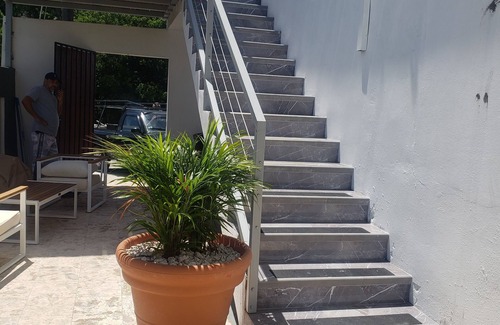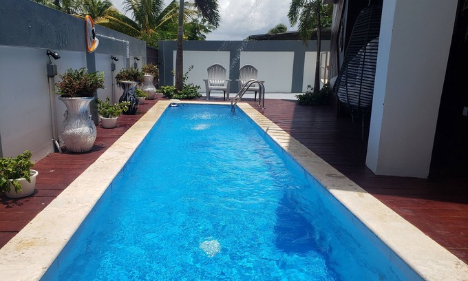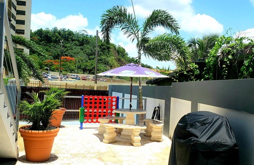 Beautiful modern studio 2nd floor .This property is fully new .Studio is fully equipped stainless steel appliances full kitchen Ac unit, and flat 70 inches tv, beautiful backyard with swimming pool close by aguadilla airport ,restaurants, fast foods,fitness center .