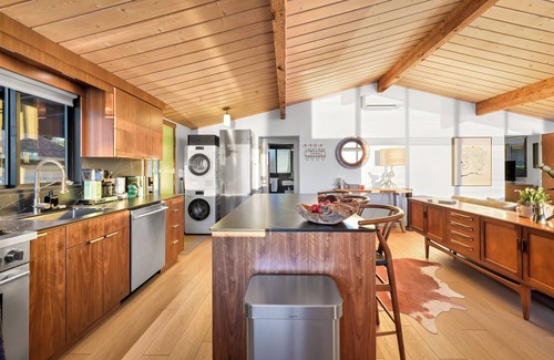 Escape to this stunning oceanfront getaway—a completely updated Mid-Century Modern home offering direct private beach access, a relaxing sauna, and panoramic views of the sunset over the water. Whether you're looking for a romantic weekend, a cozy family stay, or a relaxing retreat, this property has everything you need.