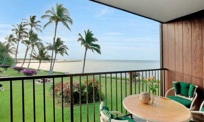 Celebrate your first day of vacation on your private lanai that features views of the lush grounds and Pacific. Here guests will enjoy planning the day with a fresh fruit concoction from their blender or local brew over a homemade breakfast. There is seating for four guests on the lanai.