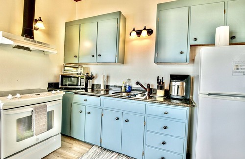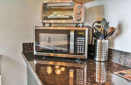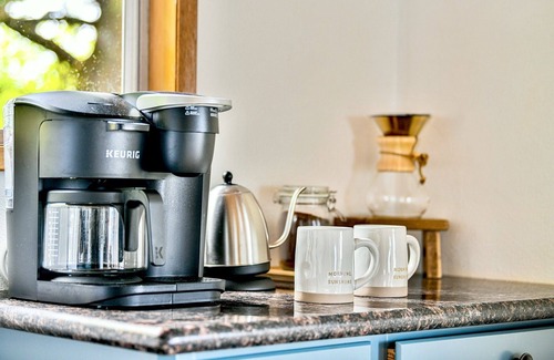 In the morning, grab a mug and enjoy a relaxing cup of coffee from our coffee station and help yourself to a kitchen fully stocked with cookware, bakeware, microwave, air fryer, and toaster oven for meal prep. A large dining table seats your hungry group.