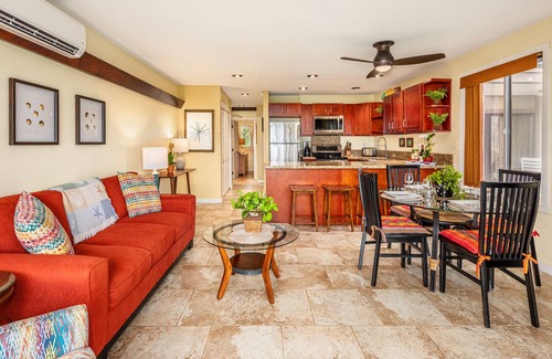 A one bedroom, King Size bed, with a Queen Sleeper couch and AC (2 Ductless Mini Splits on the walls in the Living Room and the Bedroom). Pono Kai resort with lots of amenities: Adjacent to Old Kapaa Town and Bike Path. https://ponokai.com