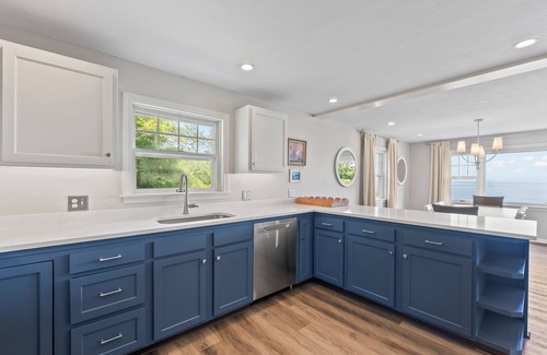 The open first floor allows for unobstructed views of the Gulf of Maine while prepping in the kitchen, enjoying a sit-down meal or relaxing in the living room.