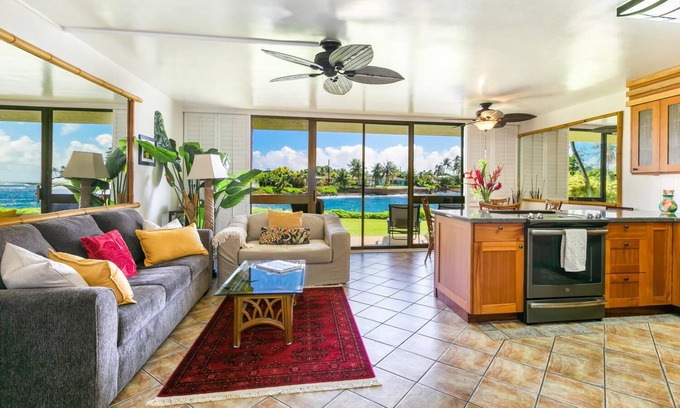 Kuhio Shores 104 is on the ground floor of this amazing ocean front property. It is very special, perfect for Honeymoon, anniversaries, birthday celebrations, and is also a place where you can completely relax! We are also close to all of the South Shore sites and activities. Only 20 feet of lush green grass separates the condo from the water. Walk right out of the large sliding glass door to experience what island paradise has to offer. No obstructions from lanai railings, just the freedom to enjoy the ocean and our beautiful property. Feel the trade winds and warm sun, breath and relax! This is the quiet side Kuhio Shores, with ever changing scenery. The sea turtles love to play in the bay. Local Hawaiian fishermen may be throwing their nets and occasional surfers with their boards may quickly pass by. Watching whales and spinner dolphins during the winter months is unforgettable. Experience these things while sitting on the comfortable outdoor furniture on our lanai, the largest in the Kuhio Shores complex!