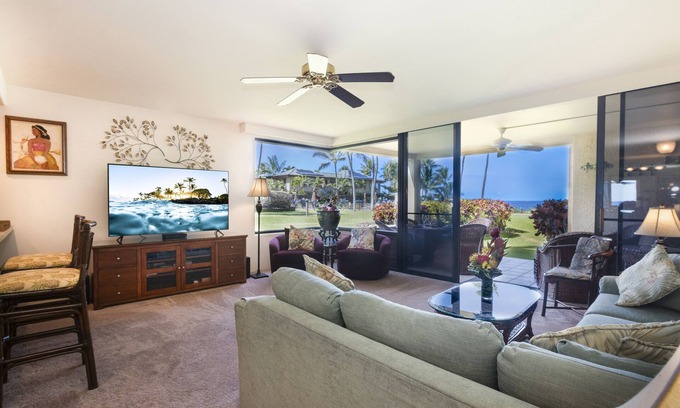 It is time to enjoy spectacular beach front living, warm water, soft sand, and incredible sunsets from our ocean view ground floor 102 condo. Our 5 star, two bedroom unit has been remodeled with warm Koa wood cabinetry, South African granite counter tops, updated furnishings and Hawaiian art. Our spacious and private lanai opens to a grassy lawn just steps away from the beach, pool, spa and barbeques.