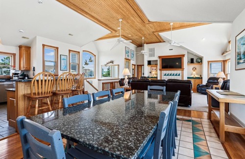 Step into the heart of Ocean Paradise, where a state-of-the-art kitchen awaits the culinary enthusiast. Gleaming granite countertops contrast beautifully with warm oak cabinetry, creating an ambiance of rustic elegance. Modern stainless-steel appliances, from the spacious fridge to the efficient oven, ensure that every meal, whether a morning brunch or a seaside dinner, is prepared with ease and style. As you brew your morning coffee or mix a smoothie, gaze out of the generous windows, which offer tantalizing glimpses of the shimmering ocean beyond. It's not just a kitchen, but a stage where delightful memories are crafted and shared. The large, open kitchen features a dishwasher and microwave as well as a breakfast bar with seating for 6. Eight bedrooms, including 5 with their own private baths, give everyone their own space, and the additional seating areas, including 2 dens, a sunroom, and game room with pool table, allow family members to gather in several areas for games, movies, and conversation.
