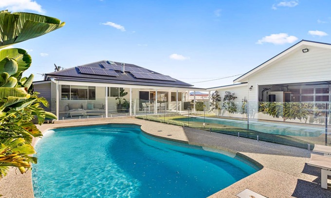 This house consists of 3 bedrooms, 2 bathrooms + 1 outdoor toilet and shower. Airconditioned open plan lounge and kitchen area with large laundry and extended kitchen area off to the side. Enclosed additional lounge/TV room looking over the sparkling pool and not to forget the outdoor kitchen with BBQ for alfresco dining. Large Smart TV in lounge with 2nd in main bedroom. Wi-Fi throughout. Linen and towels supplied but please bring your own beach towels. Highchair and/or travel cot can be hired if you require these (please mention you require this when booking). Can accommodate 8 guests.