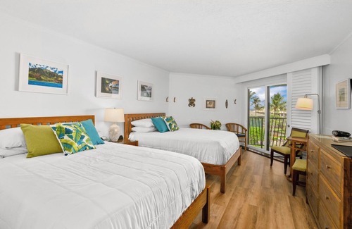 Stunning View from your room & Lanai! Welcome to your very own slice of paradise in my 5th floor (top floor) beautiful Premium Studio Suite #2540. OUTRIGGER Kauai Beach Resort & Spa. The Suite offers amazing panoramic ocean and pool views from your room and private lanai, over the lushly manicured 25 acre resort. Two New Queen Beds with Memory foam toppers! NO Resort Fee's! Secluded beach is steps away. Enjoy Luxury amenities and a Modern Hawaiian feel with sweeping Ocean Views from your room. Pools and hot tubs including waterfalls, waterslide, and kid friendly sand bottom pool. 24 Hour Fitness Center. Spa including massage. Restaurants, Tikibar, and market on site with Starbucks. Elevator access. Pool towels, beach chairs and cooler provided. Truly one of the best views of the Ocean/Pool from the suite/lanai. This is a Completely renovated hotel/condo room with new AC.