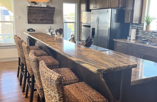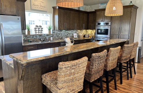 Designed with beautiful interior detail, this seaside retreat features a coveted open layout with vaulted ceilings and double-height windows offering abundant natural light. Kick back and relax with your favorite TV shows in the living room. A second upstairs living area provides more space for your group to spread out. On the top floor, you’ll find a playroom with a TV, bonus sleeping space, and wet bar. Whip up everything from beach snacks to four-course meals in the well-equipped kitchen - complete with stainless steel appliances, a coffee bar, and a center island with seating for four. Gather for special meals at the adjacent eight-seat dining table.