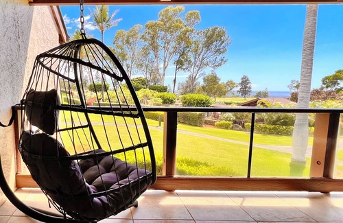 Discover pure bliss in this 2B2b villa, ideally perched on a serene golf course offering ocean views and island breeze. The expansive lanai offers a dining area with mini bar, and a living area with a wicker hanging chair.