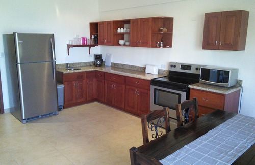The new kitchen contains custom made cabinetry with granite counter tops, a full size refrigerator with ice maker (no need to fill ice trays all day long here), full size stove/oven, microwave, blender, rice cooker, coffee pot, toaster oven, and all the silverware, plates, cups, glass ware, bakeware, and storage containers you will need.