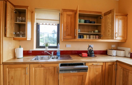 Amenities: Oil central heating with open fire. Electric oven, gas hob, fridge/freezer, washing machine, dishwasher, flat screen TV with basic Sky package, DVD, CD/radio, selection of books. Oil & electricity inc. in rent (€60 supplement payable direct to owner ). Fuel for open fire available to purchase locally. Bed linen & towels inc. in rent. Off road parking for four cars. Lawned garden to side & front & patio area with furniture & BBQ. Sorry, no smoking. Shop & pub 1.5 miles. Note: Max 10 adults. Please note: parties are strictly forbidden.