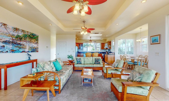 This open and airy two-bed/two-bath home sits 1,000 feet above sea level, offering cool breezes and incredible ocean and sunset vistas from the lanai. On warm days, enjoy the extra benefit of a fully centralized air-conditioning system - an uncommon perk in the area. Enjoy access to the nearby Waikoloa Golf Course, where you will receive a discounted rate.