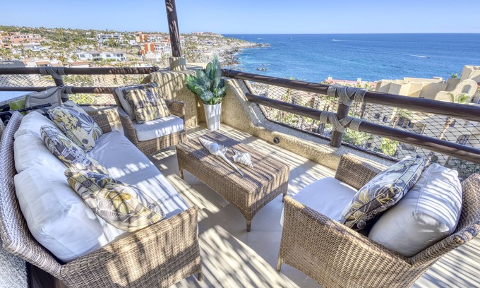 Incredible ocean views from every room! This stunning newly renovated penthouse condo has a wrap around terrace where you can wake up to beautiful breathtaking sunrises in the morning, whale watch or sit and marvel at the stunning views of the Sea of Cortez, the Pacific Ocean and the famous Lands End. The gentle ocean breeze keeps you cool and the sound of ocean waves lull you to sleep at night.