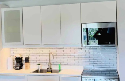 TV's 65" Samsung Crystal UHD (with LED lights), 1 bathroom with shower, Hot Tub, Hair dryer, Kitchen: