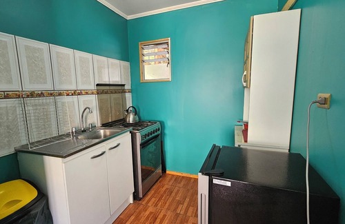 A sitting area, a dining area, and a charcoal grill are featured at this 2-bedroom, 1-bathroom rental. Bathroom amenities include towels and toilet paper. The kitchen is equipped with an oven and a refrigerator, as well as an electric kettle, a microwave, and cookware.