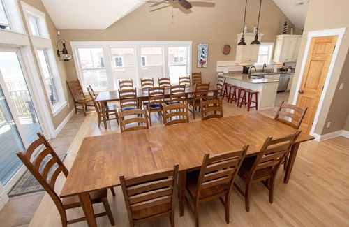 Top Level: Open great room with 2 separate seating areas, 2 TVs, desk area and ocean views, half bathroom, dining room seating 22 with deck access and ocean views and a gourmet kitchen with stainless appliances including 2 refrigerators, 2 ovens, 2 microwaves, 2 dishwashers, 2 sinks, a pantry and breakfast bar seating 4. King Master Bedroom with handicap friendly features, TV, ocean views, deck access and private bathroom and a King Master Bedroom with TV.