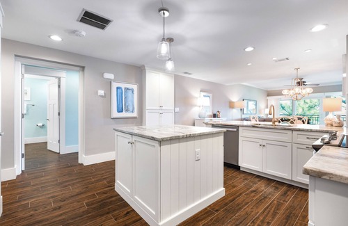 Two bedrooms (1 King, 2 Queens) each boast the comfiest bed linens we could find, with fluffy pillows as well as all digital TVs. Two full, en suite bathrooms are fully renovated and sparkling clean. There is laundry in unit.
