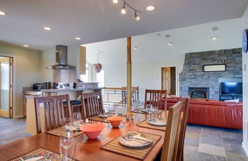 The upstairs living area feels spacious with vaulted ceilings and tile floors. Watch a movie in the living room using the flatscreen TV's Blu-ray DVD player with heat from the fireplace, or play games at the dining room table for six.