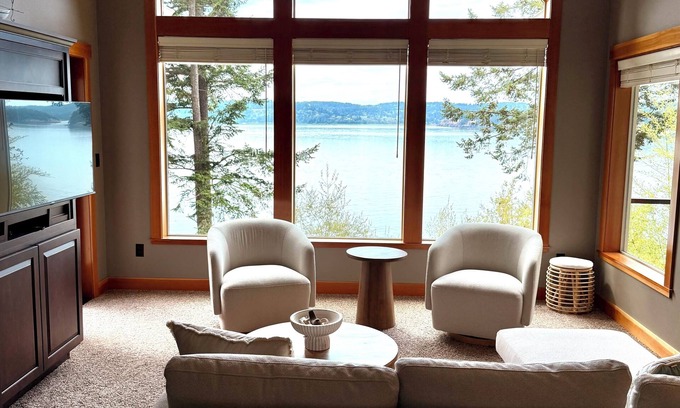 Experience unparalleled ocean views from this stunning 2-level waterfront home just 5 minutes from La Conner. Wake up to sweeping water vistas from nearly every room, sip coffee on your private master balcony, and watch eagles soar over the Salish Sea. With 2.5 baths, dual kitchens, multiple decks, and space for 5 guests, this is your perfect Pacific Northwest escape.