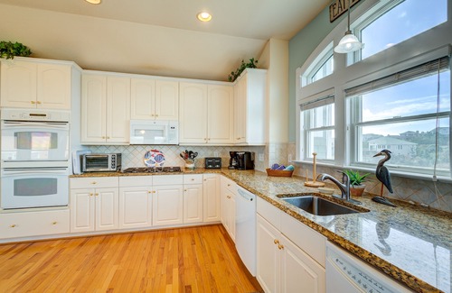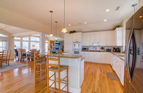 King Master Bedroom with Handicap Friendly Bathroom, Jacuzzi, Ocean Views, TV, and Deck Access. Great Room with Gas Fireplace and Flat Screen TV, Kitchen with Double Wall Oven, Bar (seats 6), 2 Dishwashers; Dining Area with 2 Tables (Seats 12).