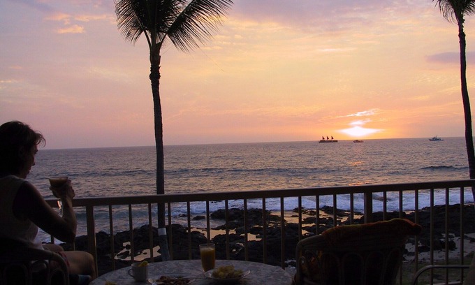 Kona Reef, beautiful one-bedroom, direct oceanfront condominium, on world-famous Alii Drive. Our condo is 23 feet from the ocean and offers spectacular sunsets. Watch the surfers and the dolphins from the lanai.