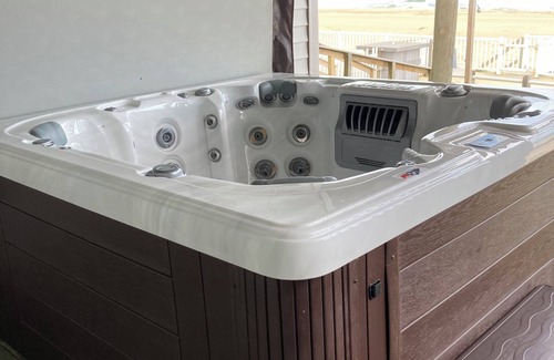 The master bedroom also on the 2nd floor has a king bed with a small sitting area including a sofa and a mini frig. The master has a large bathroom with a 2 person open shower and 2 sinks with separate water closet. There are two decks off the master bedroom one holds the hot tub. Both decks are covered. (Hot tub can be reached from the Oceanside also)