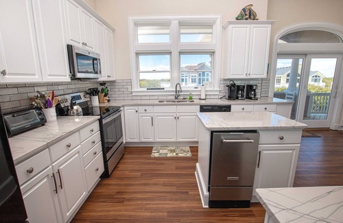Top Level: Features the great room with ocean views, gas fireplace, large smart TV and Bluetooth sound system. The spacious dining room table seats 12 and the breakfast bar seats 6. The gourmet kitchen (recently updated in 2023) features quartzite counter tops, double dishwashers, double ovens, and an icemaker. The kitchen is well equipped with all of the cookware and gadgets you could ever imagine, serving dishes, appliances and much more. The Sunroom has comfortable seating and dining area seating 6. The oceanside deck is spacious and features multiple rocking chairs and a dining table that seats 8. The oceanside deck further entertains with its own Bluetooth sound system (separate from all others), The Soundside deck that can be accessed from either the kitchen or the Sunroom has a seating area with Adirondack chairs to enjoy those sunsets over the sound, a gas grill, a bistro table for 2, rocking chairs and it's own Bluetooth sound system (separate from all others). The King Master Bedroom Suite with Roku TV, its own Bluetooth sound system (separate from all others), private deck and private oversized bathroom with a whirlpool tub and a separate shower.
