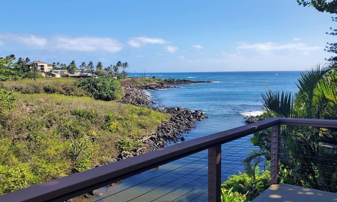 Our oceanfront Studio is located on a quiet lane of private vacation homes, 20 feet from the water, and overlooks a sea turtle spot, and out to the Pacific in the exclusive Poipu Beach. This lovely studio is located on the home's 2nd floor nestled on a private tropically landscaped, gated property near white sand beaches, dive, snorkel and surf spots, fine restaurants and two golf courses.