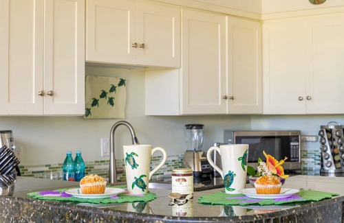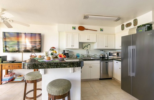 Fully equipped with a large variety of High-Quality Cookware for Happy Hour fun, intimate Ocean View Dinners, and normal day-to-day cooking. Every appliance is full-size: side-by-side Refrigerator, Oven & Range, Microwave and Dishwasher. Beautiful Granite Countertops and for greater convenience, a wider & slightly higher Breakfast Bar with 2 cushioned Bar stools.