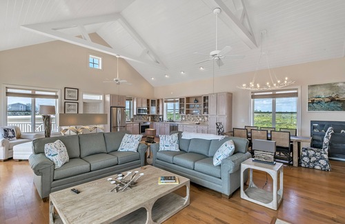 This deck is accessed through the open 2nd floor living, dining, and kitchen areas that are set up to make sure your vacation party maximizes its socializing and fellowship for an unforgettable vacation. You can also access the deck and walkway with direct access to the beach from the hall bathroom. The dining area accommodates 8 people, overlooking a gourmet kitchen and stylish family room.
