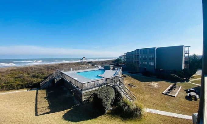 OCEANFRONT, 3rd fl. condo in the heart of Duck, NC is just minutes from the beach, shops, restaurants and public bike paths in this charming town. New flooring, appliances, fully stocked kitchen, and comfortable bedding compliment this vacation retreat! Amenities include a community pool, dune top deck, and community boardwalk to the beach. Comfortable and spacious living area for 5. Large 10X14 deck great for enjoying morning coffee relaxing. Tennis, pickle/basket ball and Playground for kids.