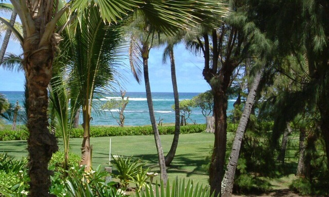 Honu Hale Kai is a warm and casual home base for your family vacation adventure. This home sits upon an oceanfront property (one house back) with a white sand swimming beach only 80 steps away. Ocean views can be seen from this home. This vacation home is two stories. The upstairs level is the main living room with its own fully equipped kitchen with dishwasher, disposal and washer & dryer. The master bedroom offers a teak wood queen size poster bed. . Enjoy your own private spa tub and separate walk-in shower. A small covered lanai is a welcome area for those who want to enjoy their first cup of coffee, viewing the ocean whitewater or read a good book before others awake. Downstairs is great for a second and/or extended family joining you, or for the kids. One bedroom has a queen size bed and the other has two Xtra Long single beds. This level has 2 bdrms, 1 full bath and its own living room with a TV and convenient kitchenette .