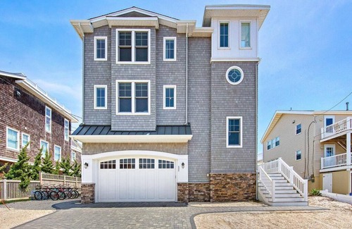 LBI Sandcastle is a newer Oceanfront home offering panoramic views of ocean and bay via floor to ceiling windows, wraparound porches, and soaring rooftop deck. Catch sunrise, sunset, and enjoy direct access to the beach through the private walk. 7-person Hot Tub added in 2025!