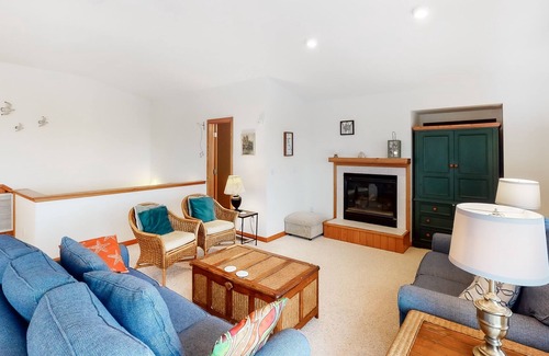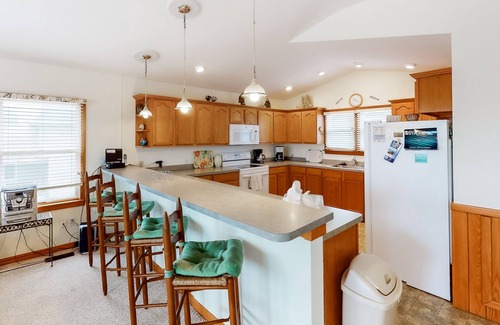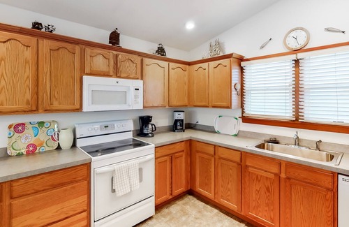 The top floor features an open great room with a TV and gas fireplace, a well-equipped kitchen with bar seating and an accommodating dining table. Just off the great room is a half bathroom and outside you'll enjoy sunning on the comfortably equipped decks.