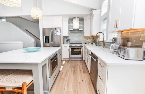 Mid Level: Main entry and foyer. 2 King Master Bedrooms each with flat-screen TV, private deck access and private bathrooms, one with tiled shower. King Master Bedroom with flat-screen TV, deck access, and private bathroom. Hallway laundry area with washer and dryer. Half bathroom between levels.