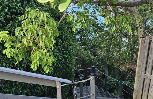 The studio has its own staircase from the parking area to its entrance, along with a private deck. The ocean trade winds keep the apartment cool, but air conditioning is available if you feel the need. Wi-Fi is available, TV with DVD player, no cable TV. Modest accommodations for a modest budget.