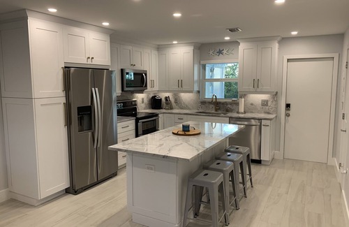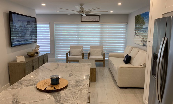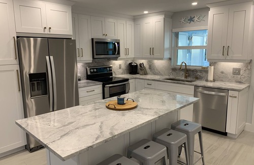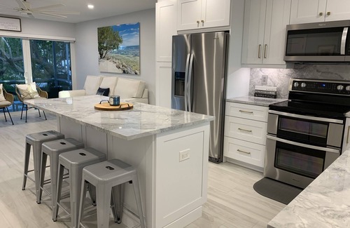 This fully renovated townhouse has a new kitchen with granite counter tops and stainless steel appliances. The living area has a queen sleeper sofa with a memory foam mattress and a 75' smart TV. The unit has a front porch area with seating and a bbq. The back of the unit overlooks the saltwater lagoon. Upstairs you will find 2 bedrooms one is the master with a king bed and a screen balcony. The second bedroom has a full size and twin size bed.