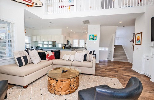 Ground Level: Exterior amenities include a private gated pool with a hot tub, sand volleyball court, basketball hoop, outside shower and 2 charcoal grills. Inside you'll find a King Bedroom with flat-screen TV, patio access and a semi-private bathroom (second door from bathroom to the pool area) and a King Master Bedroom with flat-screen TV and a private bathroom.
