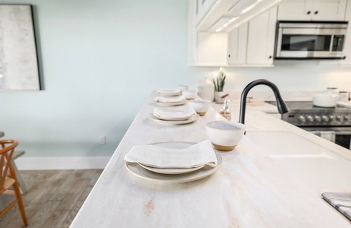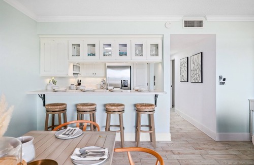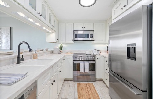 Ocean Villa 2 offers two serene king bedrooms and two updated bathrooms - a spa like ensuite with a walk-in rain shower plus a guest bath with a tub/shower combo. Thoughtful touches include an in-unit washer/dryer, stylish coastal decor, and plenty of natural light throughout. You're just steps to the sand, so bring your swimsuits and settle into easy, barefoot living.