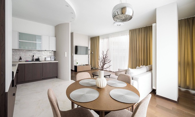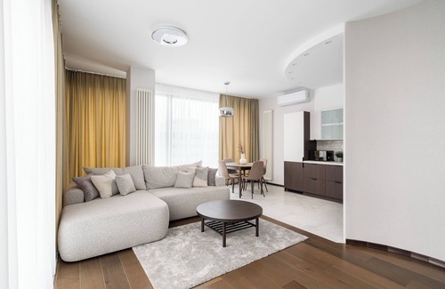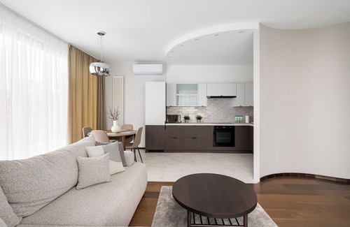 Guests have access to a wide range of amenities, including free Wi-Fi, a TV, a washing machine, an iron, a fridge with freezer, an oven, a microwave, an induction cooktop, an electric kettle, and a full set of kitchen accessories. For added comfort, the apartment is equipped with air conditioning, which provides a pleasant indoor climate even on the hottest days. There is also a parking space available in the underground garage, which is a great convenience for guests traveling by car.