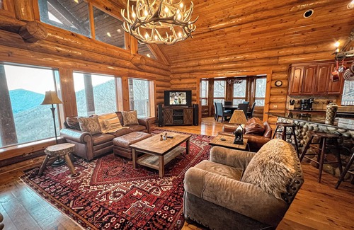 West Jefferson, NC - One-of-a kind magnificent log home w/Australian cypress floors, gourmet kitchen, marble tile w/custom accents, and two river rock fireplaces (great room & den). There's even bear statues carved into the massive logs. Top of the world views are yours as well as privacy -yet only 5 min from West Jefferson. The main level features three bedrooms & 2 baths - including the large master suite w/TV, & bath with oversized Jacuzzi tub & steam sauna! One guest bedroom features queen bed & sitting area, other guest bedroom offers two twins. Downstairs is a den with f/p, pool table, TV/DVD, two more bedrooms (2 twins & 1 queen), third full bath with stand up shower, double sinks, and a separate laundry room. For the ultimate in vacationing comfort & pleasure, Picture Perfect fits perfectly! Only 25 min to Boone, 35 to Blowing Rock, & Valle Crucis. For some winter fun, head to one of our three most popular ski resorts: Appalachian Ski Mtn, Sugar Mtn, or Beech Mtn.
