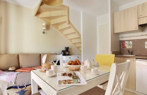 "Odalys Référence le Mas des Flamants", 2-room terraced house 35 m2 on 2 levels. Bright: living/sleeping room with 1 double sofabed, dining table and TV. Exit to the terrace. Small, open kitchen (dishwasher, 2 ceramic glass hob hotplates, kettle, microwave, freezer, electric coffee machine). Upper floor: 1 room with 1 french bed. Sep. WC, bath or shower. Electric heating. Terrace. Terrace furniture. Facilities: children's high chair, baby cot (extra). Internet (WiFi, free). Please note: non-smoking house. Maximum 2 pets/ dogs allowed. Smoke alarm.